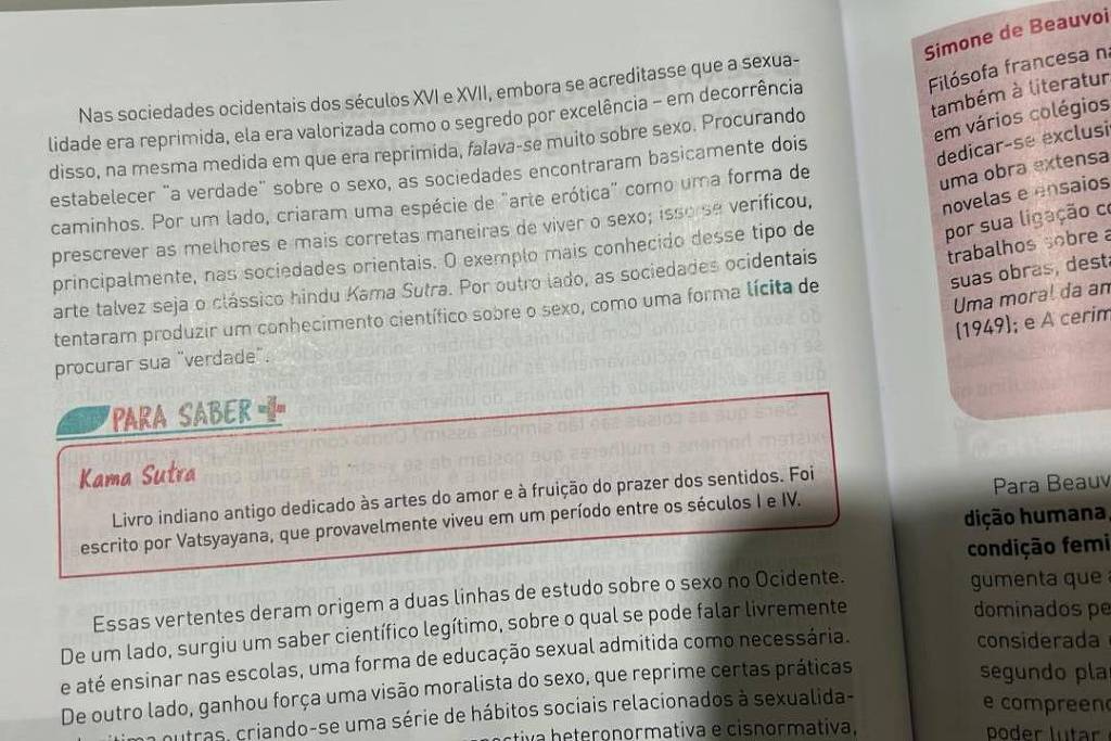 O material criticado faz parte do livro 'Filosofia: Experiência do Pensamento', de Sílvio Gallo, utilizado na escola. A passagem diz o seguinte sobre o 'Kama Sutra': 'livro indiano dedicado às artes do amor e à fruição do prazer dos sentidos. Foi escrito por Vatsyayana, que provavelmente viveu em um período entre os séculos I e IV.' Essa abordagem leve e informativa contrasta com a preocupação expressa pela deputada, levantando questões sobre o real conteúdo pedagógico do livro.